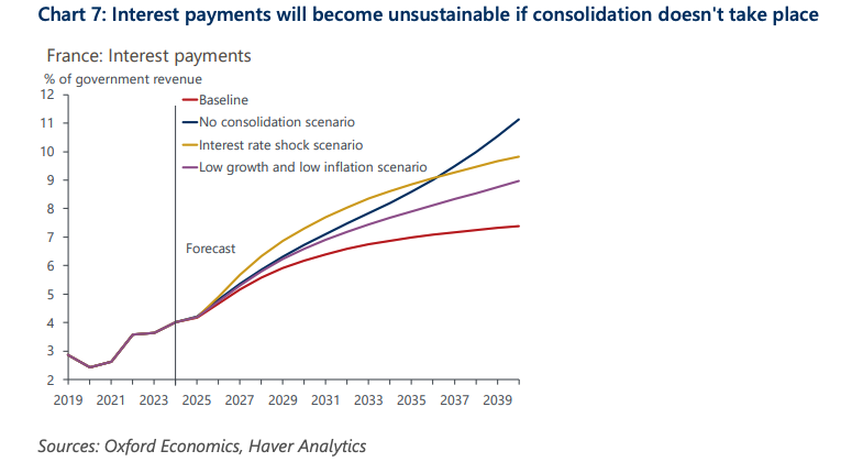 Ze voorspellen een stijgende rente voor de Fransen terwijl de economische groei onder de 1 procent zal dalen tegen 2030 door vergrijzing. Het verschil tussen de gemiddelde rente die de overheid betaalt op haar schuld en de nominale economische groei zal verslechteren. Vanaf begin jaren 2030 zal die gemiddelde rente naar verwachting hoger liggen dan de groei. Tegen 2035 zal Frankrijk tot de landen behoren met de meest ongunstige schuldpositie onder de ontwikkelde economieën.