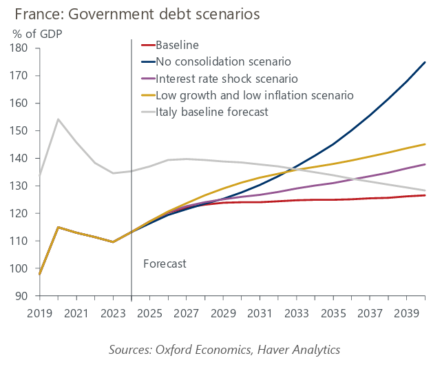 Scenario’s groei Franse staatsschuld (bron: Oxford Economics)
