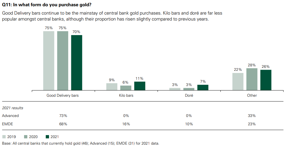 Central banks mainly buy gold in the form of 'Good Delivery' gold bars. These are bars of 400 troy ounces (about 12.5 kilos) with a purity of at least 99.5% gold, a unique serial number and a stamp of the smelter. In the world of central banks and Bullion banks this has been the most common format for decades. Of all central banks, 70% say they buy the precious metal in this form. The share of kilobars And less pure Doré gold bars are small at 11% and 7% respectively, but did increase compared to last year.