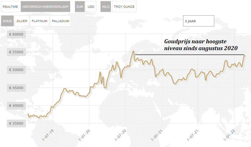 Gold prices hit their highest level in more than a year this week. Rising tensions around Ukraine and increasing concerns about the economy are causing a flight to gold as a safe haven. Gold prices rose to more than $1,900 per troy ounce, reaching their highest level since June last year. In euros, the price rose to €54,400 per kilo, converted to €1,690 per troy ounce. This is the highest level since August 2020, when the gold price recorded an all-time high of €56,240 per kilo.