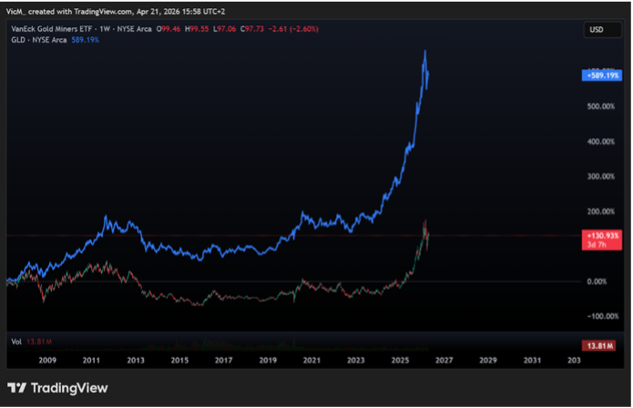 Still, this leverage does not automatically mean that gold mining stocks perform better over the long term. Since 2007, SPDR Gold Shares, which tracks the gold price, has risen by approximately 580%, while the VanEck Gold Miners ETF delivered a return of only 130%.