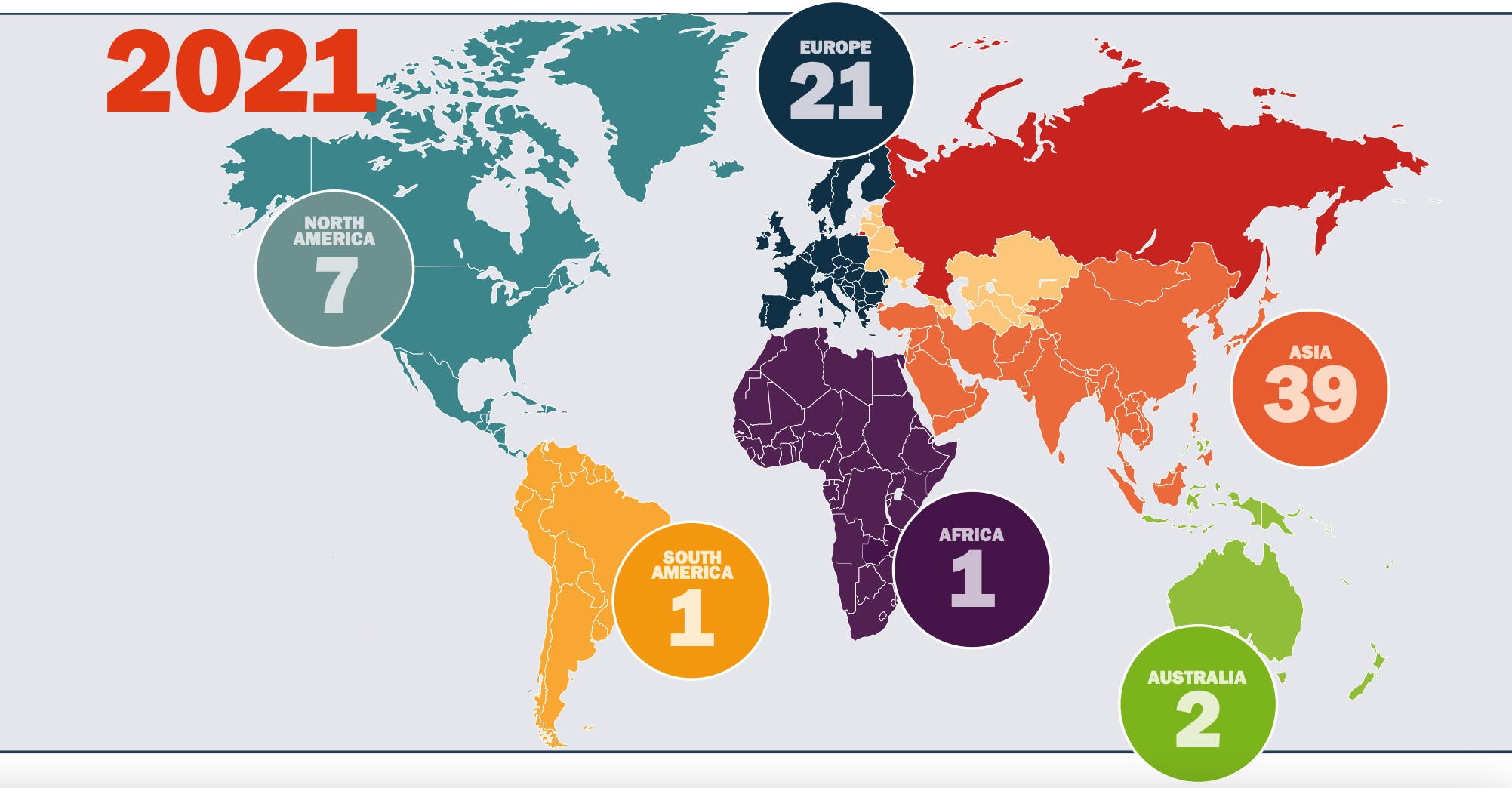 The number of LBMA-accredited smelters by continent in 2021 (Source: The Alchemist)