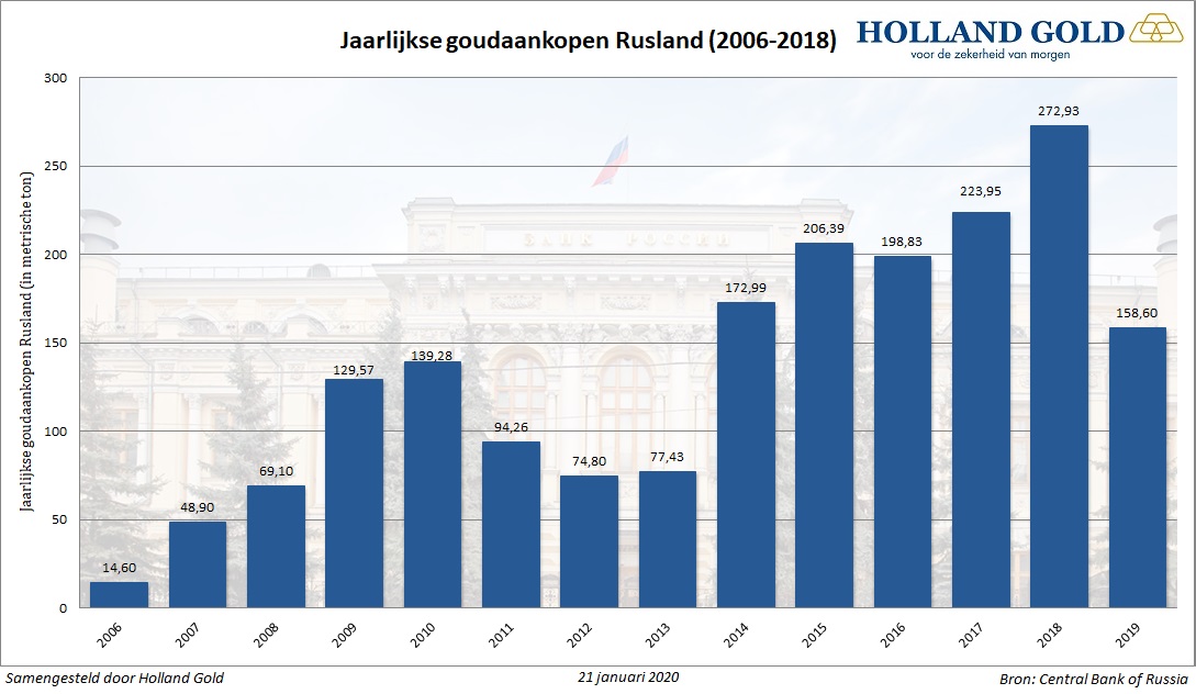 Russia has bought 158.6 tonnes of gold in the past year, according to New figures of the central bank. In December, the central bank bought 9.33 tonnes of gold, the same as in the months of October and November. The country continues to expand its gold reserves, but at a significantly slower pace than in previous years. In 2018, the central bank bought a record amount of 273 tonnes. With last month's purchase, the gold stock rises to more than 2,270 tonnes, good for a market value of $106 billion.