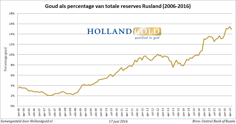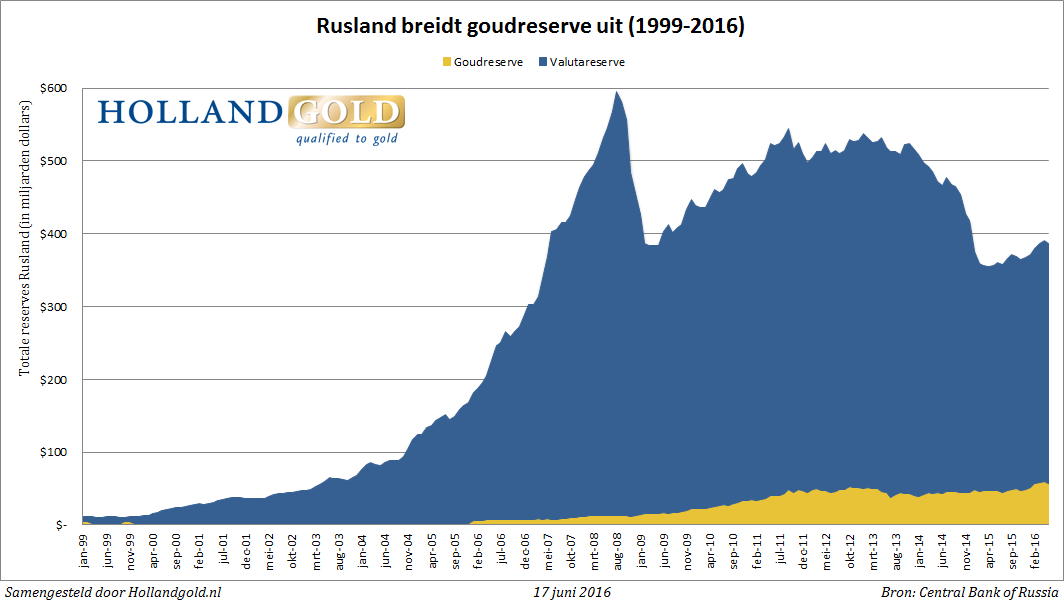 Against the total foreign exchange reserve of almost $330 billion, the yellow metal represents a share of 15%. This is considerably more than at the outbreak of the financial crisis in 2008, when the Russian central bank kept only 2% of its reserves in the form of gold.