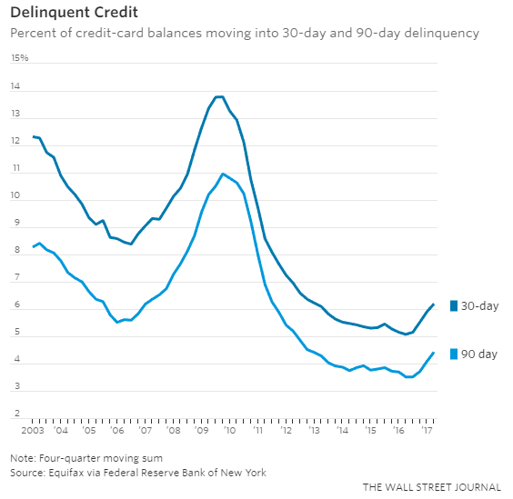 Number of defaults on credit card debt rises again (Graph via Wall Street Journal)