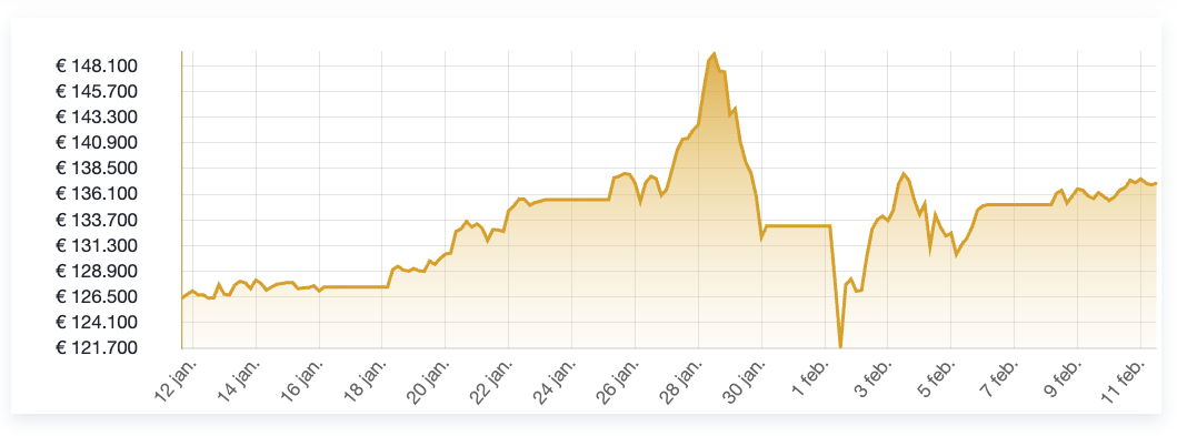 Gold price over the past week showing a brief spike from January 27 and the subsequent correction. Within a few days, the gold price recovered. Source: Holland Gold.