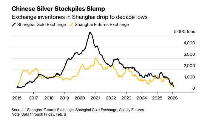 Silver inventories at the Shanghai exchange continue to decline, and China’s silver deficit is widening (source: Bloomberg)