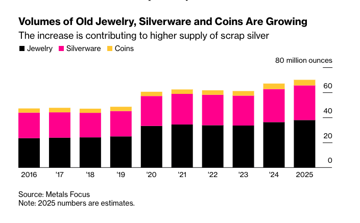 Private individuals are mainly choosing to sell silver heirlooms, as many appear to expect gold to continue rising in value, Philip Newman of Metals Focus told Bloomberg. The share of scrap silver in annual silver supply (mining, industrial recycling and melt silver) increased rapidly in 2025.