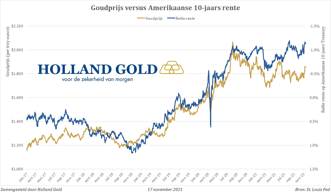Interest rates on government bonds have risen somewhat in recent months, but inflation has risen much faster during this period. For example, inflation in the US rose to 6.2% in October, the highest level since 1990. This means that money loses purchasing power faster and that it is therefore more attractive to buy gold. Especially with a negative real interest rate, because gold does not have a negative interest rate.