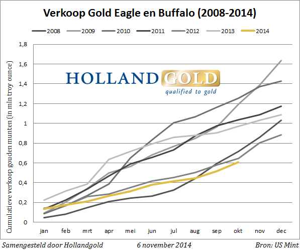 The U.S. Mint sold 5.79 million Silver Eagle coins in the month of October, the largest volume in more than a year and a half. Compared to October last year, 87.5% more silver was sold by the mint. In September, sales of 4.14 million coins were also more than 37% higher than in the same month of 2013.