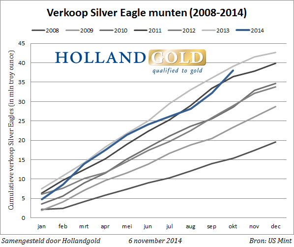 The following chart shows that cumulative sales of silver Eagle coins this year are almost as high as in 2013, the year in which a record 42.6 million Silver Eagles rolled off the production line.
