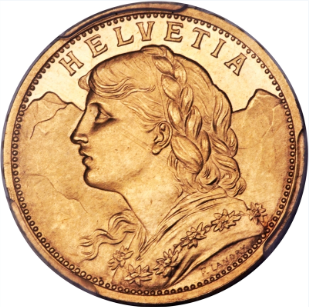 Het ontwerp van de Zwitserse gouden 20 francs vindt zijn oorsprong in 1883, toen Zwitserland de munt voor het eerst uitgaf als onderdeel van de Latijnse Muntunie. In tegenstelling tot Frankrijk, waar het ontwerp door de jaren heen sterk varieerde, kende Zwitserland slechts twee officiële ontwerpen. De eerste uitgifte, de Helvetia (1883–1896), werd ontworpen door Karl Schwenzer. Op de voorzijde staat een klassiek borstbeeld van Helvetia, de vrouwelijke personificatie van Zwitserland, met daarboven de tekst CONFOEDERATIO HELVETICA. De keerzijde toont het Zwitserse wapen binnen een eikenkrans, samen met de nominale waarde 20 F en het jaartal.