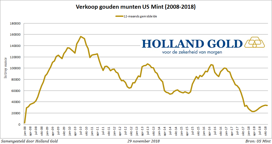 Het Amerikaanse munthuis zal dit jaar waarschijnlijk minder gouden en zilveren munten verkopen dan vorig jaar. De productie van het munthuis is zelfs weer terug op het niveau van tien jaar geleden, toen de financiële crisis net was begonnen. Natuurlijk is de vergelijking met toen niet helemaal eerlijk, omdat de prijzen per munt vandaag de dag hoger zijn dan toen. Toch is het opvallend om te zien dat de verkoop van beleggingsmunten de laatste twee jaar plotseling zo sterk is teruggelopen.