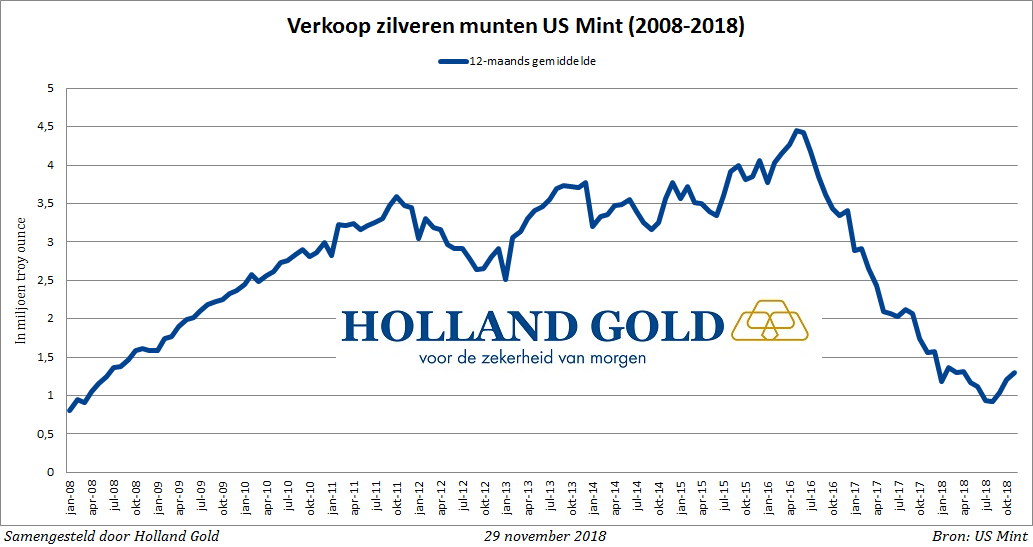 Sinds het begin van dit jaar heeft het Amerikaanse munthuis ongeveer 13,5 miljoen Silver Eagle munten geproduceerd, terwijl het totaal een paar jaar geleden nog op 40 miljoen exemplaren per jaar lag. In de hoogtijdagen verkocht het munthuis ongeveer 3,5 miljoen munten per maand, terwijl het maandelijkse gemiddelde dit jaar tussen de 1 en 1,5 miljoen munten ligt. De volgende grafiek laat deze trend zien aan de hand van het 12-maands gemiddelde.