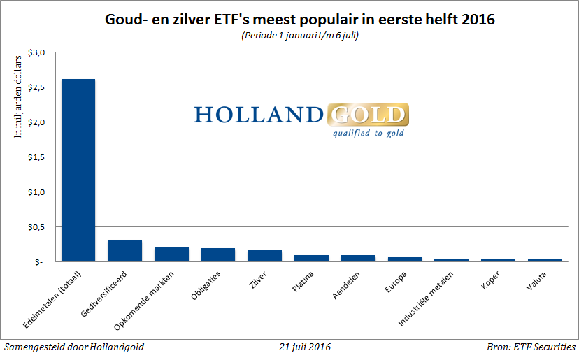 "Veruit de grootste instroom in ETF's van ETF Securities sinds het begin van 2016 was in goud-ETF's, met een totale instroom van $2,3 miljard in het eerste halfjaar van 2016. Deze stijging weerspiegelt de massale trek van beleggers naar veilige havens die werd veroorzaakt door Brexit, de onzekerheid ten aanzien van het monetaire beleid van de ECB en de Fed en zorgen over de presidentsverkiezingen in de VS.