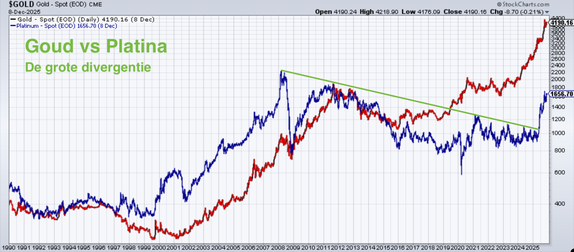 De goudprijs versus de platinaprijs sinds 1990. Platina probeert de onderwaardering goed te maken (Bron: stockcharts.)