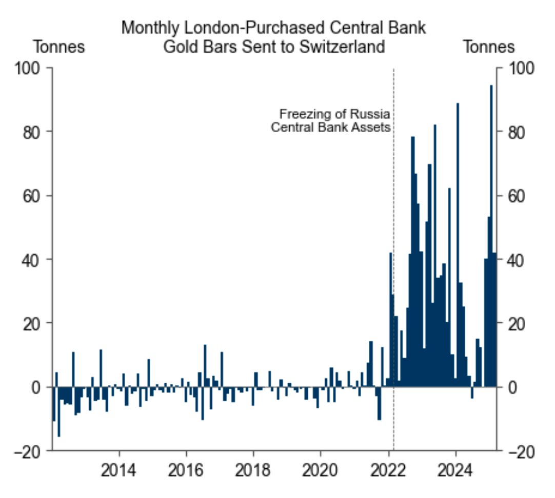 Sinds de bevriezing van de Russische activa in 2022 is er een duidelijke toename in de maandelijkse goudaankopen door niet-westerse partijen. De goudaankopen gebeuren nog vaak in Londen waarna ze via Zwitserland oostwaarts worden getransporteerd. De bevriezing van de Russische activa heeft gezorgd voor de grootste stijging van de goudprijs in 45 jaar. Het gebruiken van die Russische activa, wat nu wordt voorgesteld met alle gevolgen van dien, kan een nog grotere prijsstijging veroorzaken.
