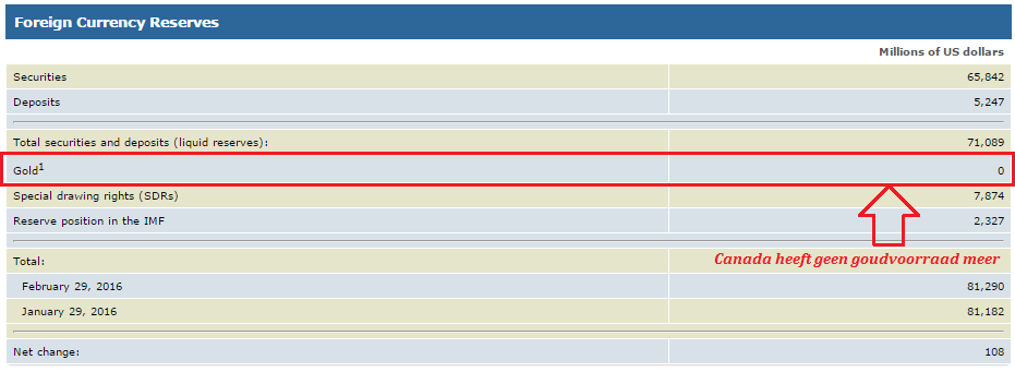 Canada heeft in februari het laatste deel van haar goudvoorraad verkocht, zo blijkt uit het laatste overzicht van het Canadese ministerie van Financiën. Eind vorig jaar stond er nog maar 3 ton goud op de balans en in januari werd daar al bijna 80% van verkocht. In februari werd het laatste deel van 21.851 troy ounce aan gouden munten ook in de verkoop gedaan. Daarmee is Canada de enige van alle G20 landen zonder een goudreserve.