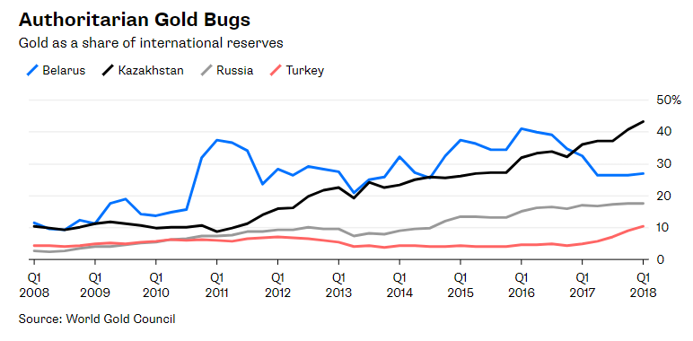 De subtiele en geleidelijke verschuiving van dollarreserves naar andere valuta en goud kan worden toegeschreven aan een klein aantal landen die zeer fanatiek goud kopen. Zo waren Rusland, Kazachstan en Turkije de afgelopen vijf jaar samen al goed voor de helft van alle goudaankopen door centrale banken. En dan hebben we de grote aankopen door de centrale banken van China en India van de afgelopen jaren nog niet meegenomen.