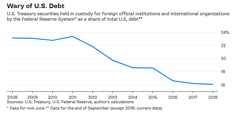 Als we kijken naar de totale valutareserves van centrale banken en het gedeelte dat bestaat uit Amerikaanse staatsobligaties, dan zien we een zeer geleidelijke verschuiving weg van de dollar. Was in 2011 nog ongeveer 23% van de Amerikaanse staatsschuld in handen van centrale banken, nu is dat nog maar 16%. Er is in de rest van de wereld dus steeds minder bereidheid om de Amerikaanse tekorten te financieren.
