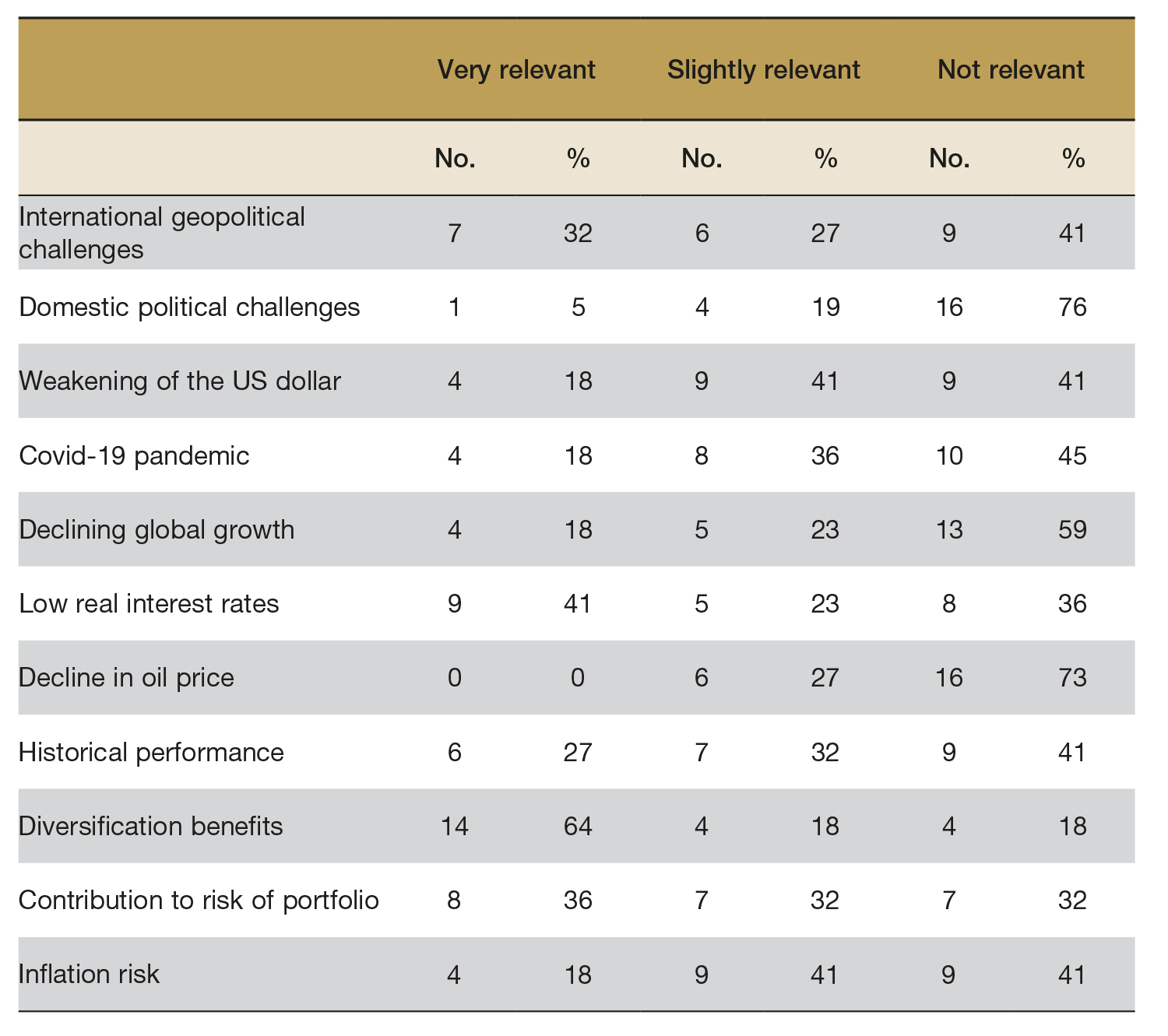 Centrale banken noemen verschillende redenen om een goudvoorraad aan te houden. De drie belangrijkste zijn diversificatie (64%), de lage reële rente (41%) en internationale geopolitieke spanningen (32%). Ook het historische rendement van goud wordt door verschillende centrale banken (27%) genoemd als reden om goud aan te houden. Minder belangrijk zijn de zwakkere dollar, de coronapandemie en afnemende economische groei (ieder 18%). Ook blijken centrale banken in rijke landen vooral waarde te hechten aan diversificatie, terwijl de minder rijke landen vooral goud kopen vanwege de lage rente.