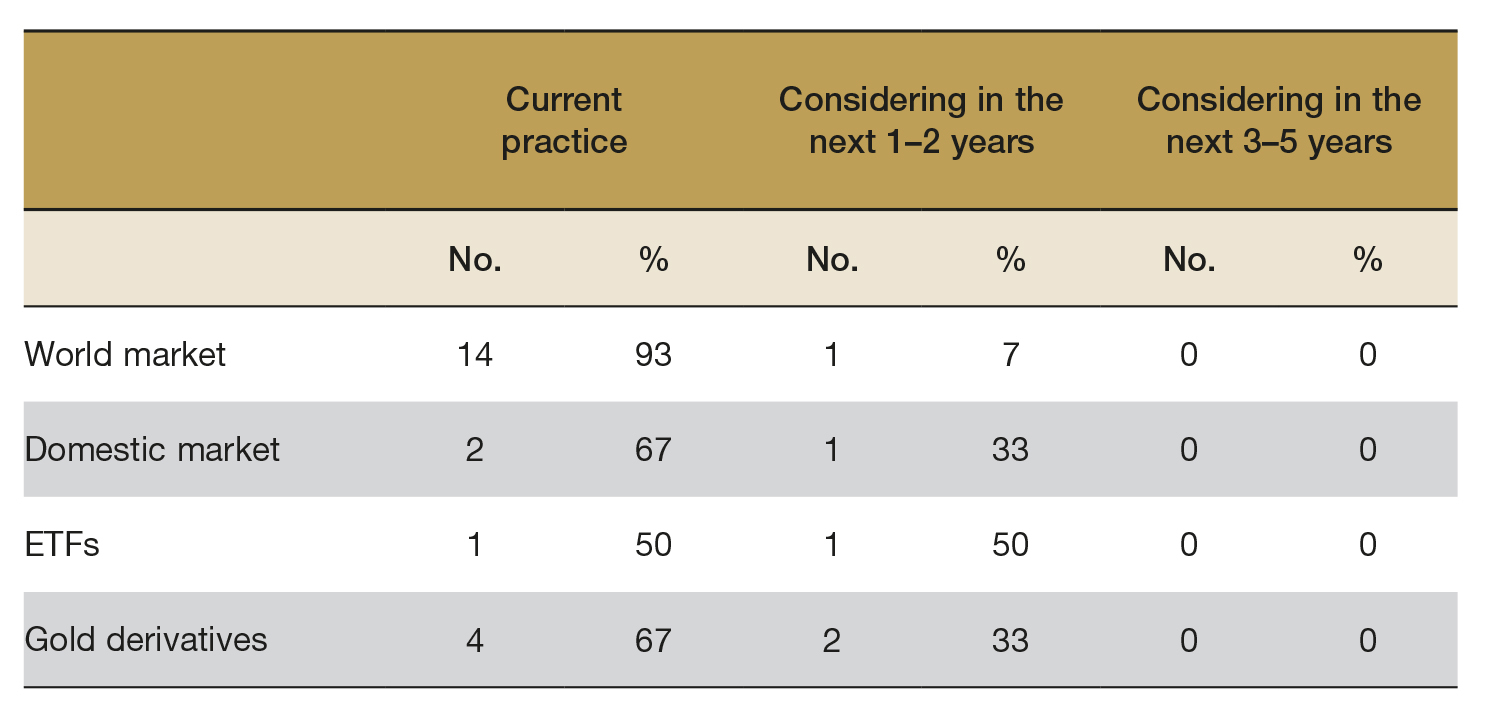 De meeste centrale banken kopen hun goud via de wereldwijde markt. Slechts twee ondervraagde centrale banken doet dat via de binnenlandse markt, terwijl vier dat doen via goudderivaten. Opvallend is dat één van de centrale banken via ETF's goud koopt, een instrument waar normaal gespreken vooral particuliere beleggers en beleggingsfondsen gebruik van maken. Deze vraag werd helaas door 11 van de 26 centrale banken niet beantwoordt.