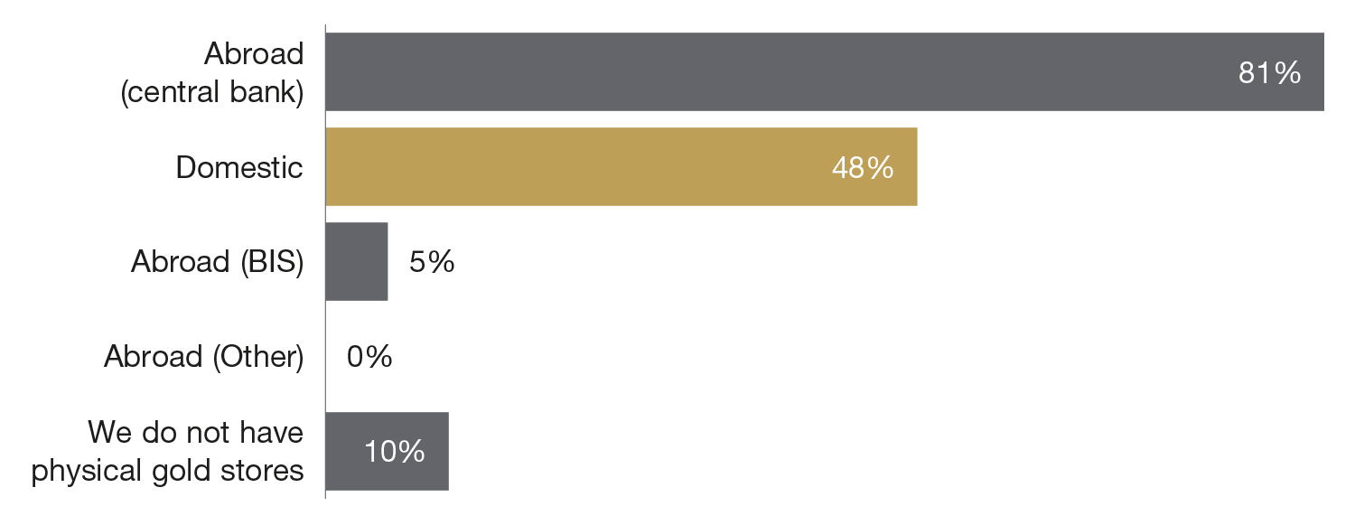 De volgende vraag is waar centrale banken hun goudvoorraad bewaren. Deze vraag werd door 21 van de 26 centrale banken beantwoordt, waarbij sommige meerdere antwoorden gaven. De meeste blijken te kiezen voor opslag in het buitenland (81%). Van deze groep blijkt bijna de helft ook goud in eigen land te bewaren. Deze vorm van spreiding is gebruikelijk voor centrale banken, zeker wanneer ze over een grote goudreserve beschikken. Twee van de ondervraagde centrale banken heeft geen opslagruimte voor goud.