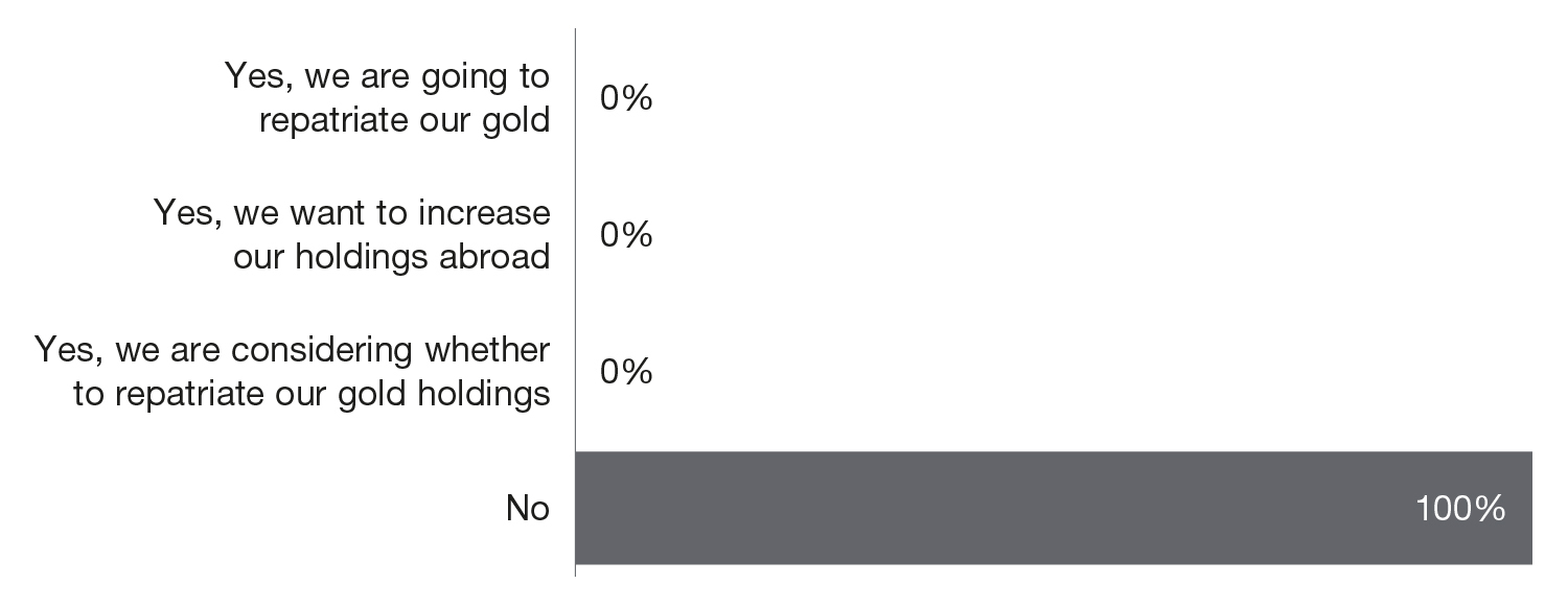 Central Banking vroeg of dit voorval het standpunt van andere centrale banken heeft veranderd. Een zeer politieke vraag, waarvan de uitkomst u niet zal verrassen. Ondanks het feit dat de enquête onder voorwaarde van anonimiteit is ingevuld durfde geen van de centrale banken haar twijfels uit te spreken over de betrouwbaarheid van de Bank of England als bewaarder van het goud van centrale banken.