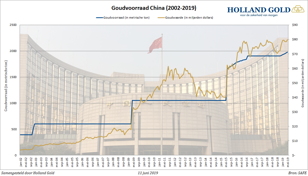 De Chinese centrale bank heeft de afgelopen twintig jaar stapsgewijs haar goudvoorraad uitgebreid. Aan het begin van deze eeuw had het land minder goud dan Nederland, maar nu heeft ze bijna drie keer zoveel als De Nederlandsche Bank. Onderstaande grafiek laat de ontwikkeling van de goudvoorraad zien, zowel in gewicht als in marktwaarde. Opvallend is dat de goudvoorraad stapsgewijs toeneemt. Dat komt omdat de centrale bank pas sinds de zomer van 2015 maandelijks cijfers publiceert. Dat was een vereiste van het IMF om de yuan op te nemen in het valutamandje van de SDR.