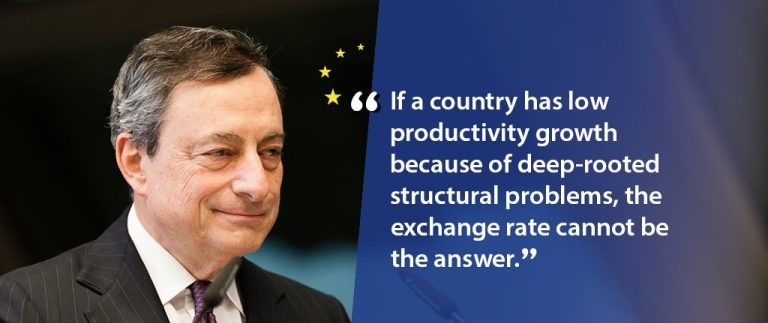 Met deze woorden benadrukt Draghi dat de centrale bank de politiek geen ruimte zal geven om het wisselkoersbeleid te beïnvloeden. In plaats van toe te geven aan de wens van een zwakkere munt moeten landen volgens Draghi juist proberen hun economie structureel te hervormen, zodat hun concurrentievermogen groter wordt. Het devalueren van de munt geeft slechts een tijdelijke impuls en biedt geen structurele oplossing. Misschien is dat wel de reden dat Duitsland zoveel productiever is dan de zuidelijke landen.