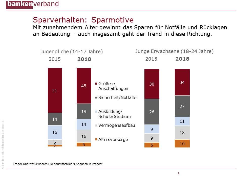 Duitse jongeren hebben dit jaar veel meer geld opzij gezet voor onverwachtse tegenvallers dan in 2015, zo blijkt uit een nieuw onderzoek van het Bankenverband, de Duitse vereniging van banken. Een rondvraag onder jongeren in de leeftijdscategorie van 14 tot 17 jaar leert ons dat de meeste jongeren sparen om grote aankopen te kunnen doen (45%), maar dat ze ook vaker geld opzij zetten om tegenvallers op te vangen (19%). Ook zijn ze meer dan in 2015 bezig met vermogensopbouw (16%) en sparen voor hun pensioen (5%).