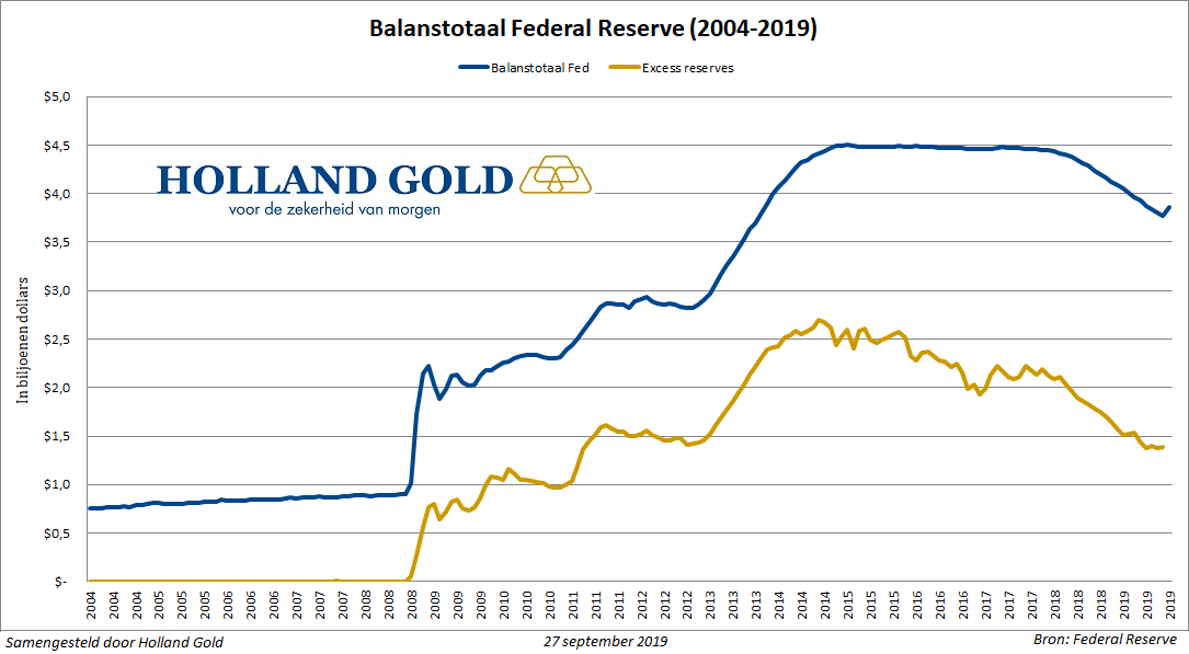 De afgelopen jaren heeft de Amerikaanse centrale bank haar balans geleidelijk afgebouwd van $4,5 biljoen naar $3,8 biljoen. De centrale bank bracht obligaties en hypotheekleningen terug op de markt en haalde daarmee weer liquiditeit uit de markt. Het bleek een ietwat optimistische strategie, want banken zitten nu verlegen om reserves.
