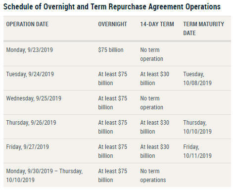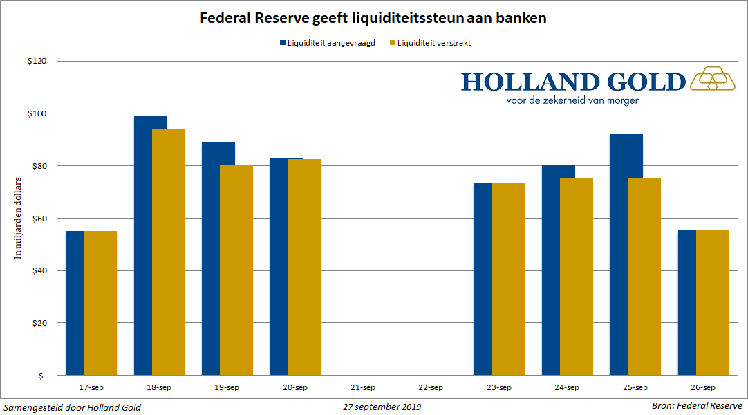 Vorige week opende de Amerikaanse centrale bank het noodloket voor banken, omdat de rente die banken elkaar in rekening brengen plotseling naar 10% was gestegen. Door een samenloop van omstandigheden ontstond er een gebrek aan liquiditeit, waardoor de prijs van geld omhoog schoot. De centrale bank besloot daarop liquiditeit beschikbaar te stellen aan banken, in ruil voor hoogwaardig onderpand als staatsobligaties en hypotheekleningen. Dit steunprogramma bleef de rest van de week actief en werd daarna zelfs verlengd tot 10 oktober. Ook werd het uitgebreid met 14-daagse leningen.