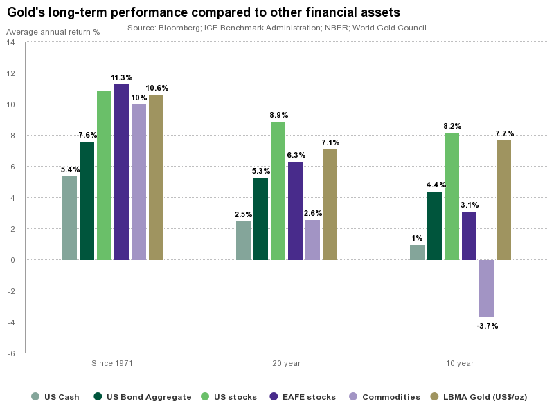 Kijken we naar de resultaten van de laatste twintig en laatste tien jaar, dan blijkt goud niet onder te doen voor andere beleggingen. Het gele metaal leverde een beter rendement op dan obligaties, zonder dat dat ten koste gaat van de liquiditeit.