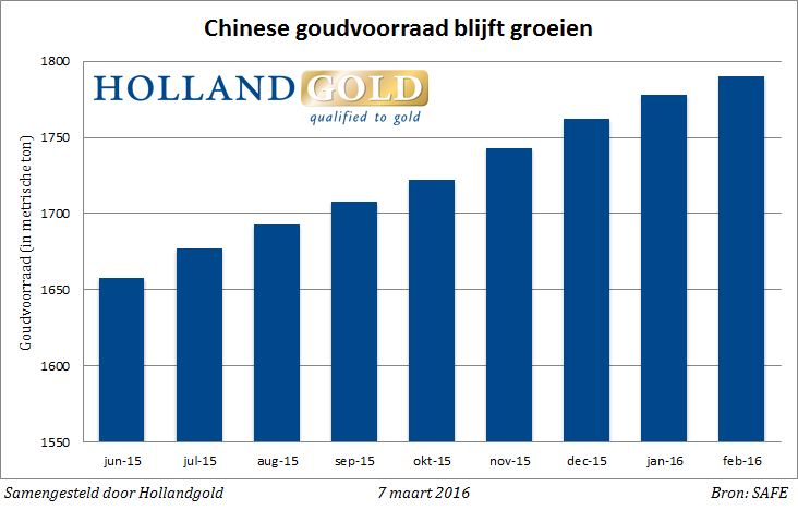 China heeft in de tweede helft van vorig jaar 120 ton goud aan haar reserves toegevoegd. Volgens schattingen van Barclays zal de volksbank van China haar voorraad dit jaar met 215 ton uitbreiden. Tussen 2009 en 2015 voegde de centrale bank al meer dan 600 ton aan haar voorraad toe.