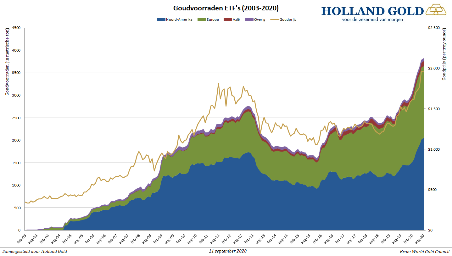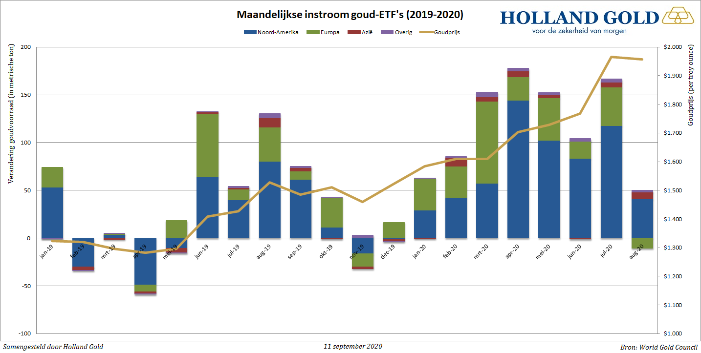 In augustus waren het vooral Amerikaanse beleggers die in goud stapten, want de voorraden van Europese goud-ETF's daalden juist. Door de sterkere euro en een positiever sentiment op de aandelenmarkt verkochten meer Europese beleggers hun posities in goud. Dit wordt gedeeltelijk gecompenseerd door toegenomen vraag vanuit Azië. Door de terugval in de goudkoers na het record van begin augustus durfden meer Aziatische beleggers weer goud te kopen. Goud-ETF's die de Aziatische markt bedienen voegden in augustus 7 ton aan hun voorraden toe, terwijl de voorraden van Europese goud-ETF's met bijna 11 ton daalden.