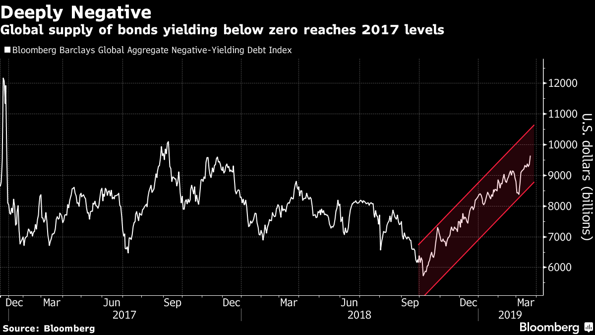 Steeds meer staatsobligaties hebben weer een negatieve rente (Bron: Bloomberg)