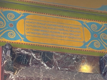 De tekst van deze inscriptie is geschreven in oudhollands en doet archaïsch aan, maar bevat een waarheid die moderner en relevanter is dan veel mensen beseffen. Het bevat een dieper inzicht in het belang van stabiel geld. Niet alleen voor handel, maar ook voor de samenleving als geheel. Hieronder ziet u een foto van één van de twee schilderingen, die samengevoegd het volgende kwatrijn vormen:
