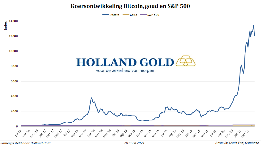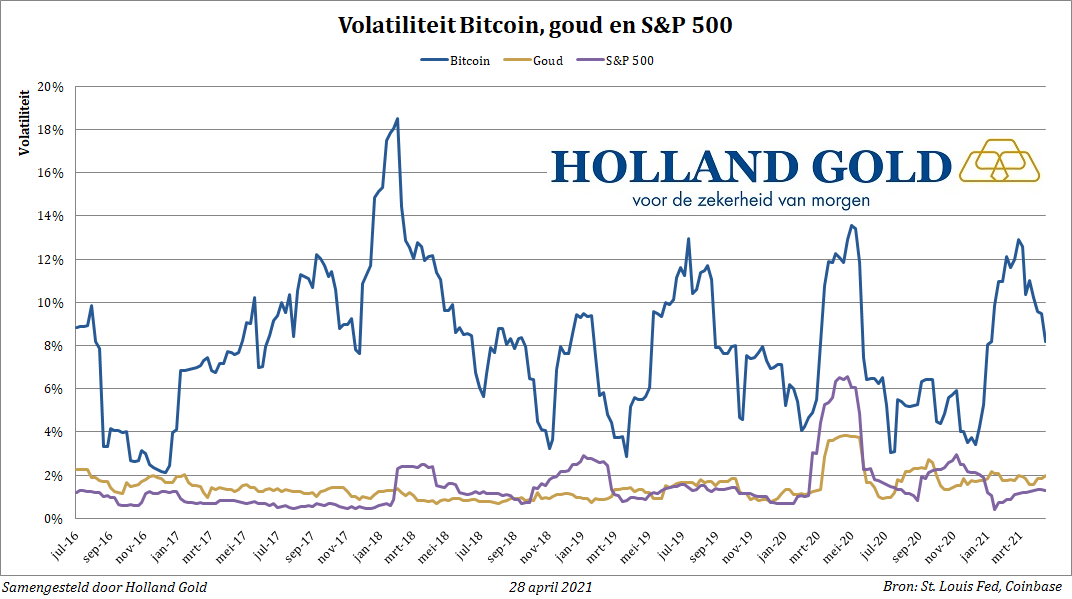 De afgelopen jaren heeft de virtuele munt een spectaculair rendement behaald, want de koers ging vele malen over de kop. Beleggers moesten daarvoor wel tegen een stootje kunnen, want er waren ook periodes dat de koers hard onderuit ging. In dat opzicht was goud een minder risicovolle belegging, want het edelmetaal liet de afgelopen jaren veel minder volatiliteit zien. Sterker nog, de volatiliteit van goud was de laatste jaren zelfs lager dan die van de S&P 500, de belangrijkste aandelenindex in de Verenigde Staten.