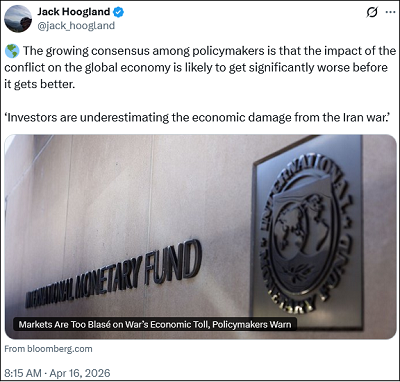 Eerder deze maand kwamen centrale bankiers en ministers van financiën vanuit de hele wereld samen voor de door het IMF en de Wereldbank georganiseerde jaarlijkse Spring Meeting. De tweet hieronder maakt duidelijk dat die beleidsmakers vinden dat beleggers de economische schade van de oorlog onderschatten.