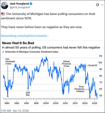 De Amerikaanse economie heeft van alle landen zo ongeveer het minste last van de huidige energiecrisis. In de tweet hieronder zien we echter dat het consumentenvertrouwen nu is gedaald naar het laagste niveau ooit gemeten.