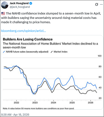 En hieronder zien we dat huizenbouwers, die hoopten op herstel van de huizenmarkt, hun vertrouwen weer aan het verliezen zijn.