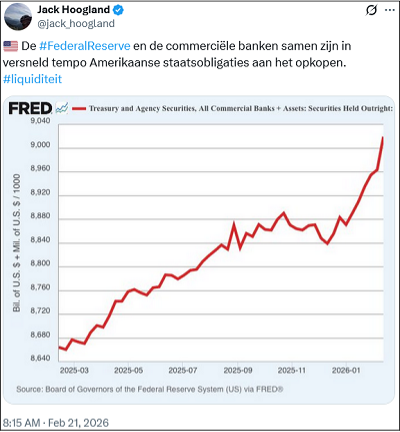 De grafiek hieronder laat zien hoe hard het saldo aan opgekochte staatsobligaties bij de Federal Reserve en de commerciële banken samen nu aan het oplopen is.