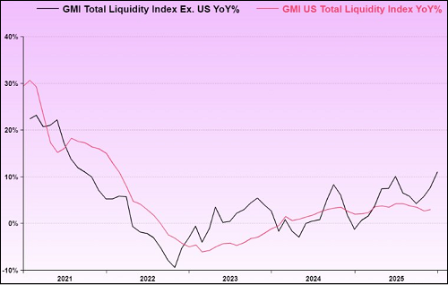 In onderstaande grafiek van Raoul Pal zien we dat liquiditeit wereldwijd aan het stijgen is, maar tegelijk dat deze stijging in de VS (rode lijn) aan het afzwakken was.