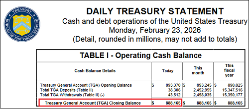 Vorige week had het ministerie van Financiën maar liefst $925 miljard op zijn bankrekening bij de Fed staan. En op de afbeelding hieronder zien we dat dit saldo nu $888 miljard bedraagt.