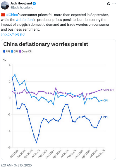 En in de tweet hieronder dat China nog altijd te kampen heeft met deflatie. Waardoor China vrijwel zeker met méér stimuleringsmaatregelen gaat komen.