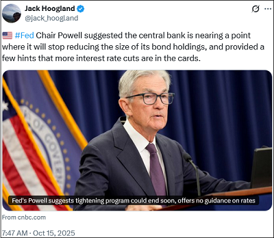In onderstaande tweet zien we dat Powell vorige week aangaf te gaan stoppen met Quantitative Tightening én de rente verder te gaan verlagen.