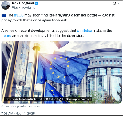 Ook de ECB gaat fors stimuleren. De tweet hieronder betreft een artikel van de Franse econoom Christophe Barraud die vier redenen geeft waarom inflatie in de eurozone komend jaar fors onder de door de ECB gewenste 2% zal dalen.