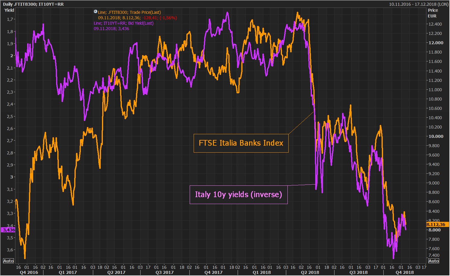 De Italiaanse bankensector staat onder druk door de schuldenproblematiek van de Italiaanse overheid. De staatsschuld bedraagt meer dan 130% van het bbp, maar dat weerhoudt de nieuwe regering er niet van om volgend jaar opnieuw meer geld uit te geven dan er binnenkomt. De Europese Commissie heeft de Italiaanse begroting afgekeurd, omdat ze van mening zijn dat Italië te weinig doet om haar schulden onder controle te houden.