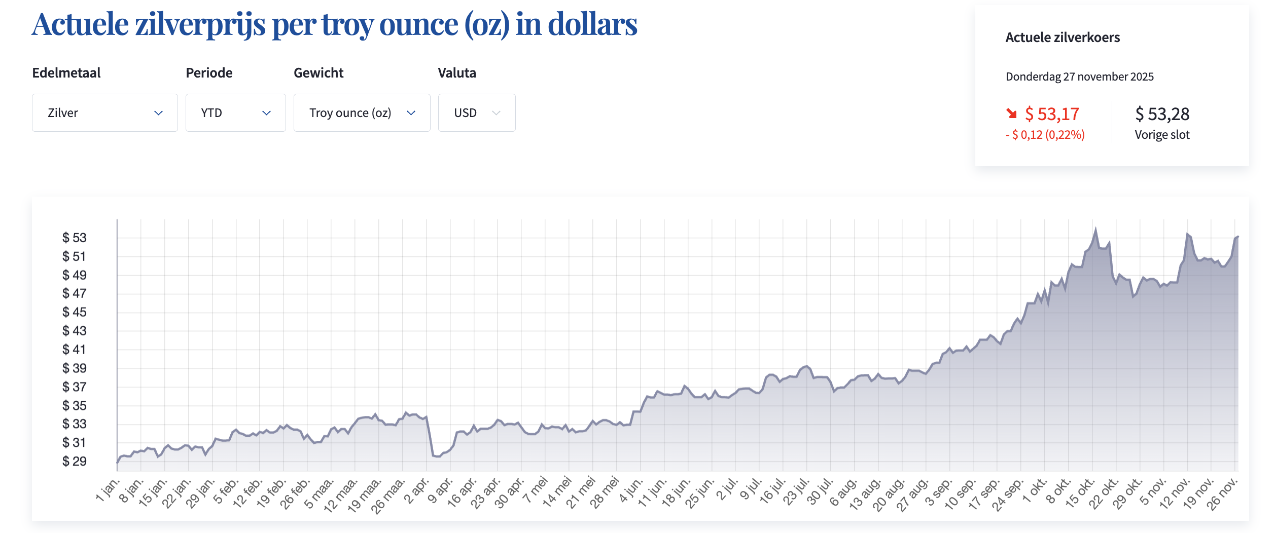 Goud houdt zich opmerkelijk sterk na de recordprijzen van dit jaar en noteert nog altijd dicht bij zijn top. Zilver blijft beweeglijk en één trend is duidelijk: edelmetalen behoren tot de grote winnaars van 2025.